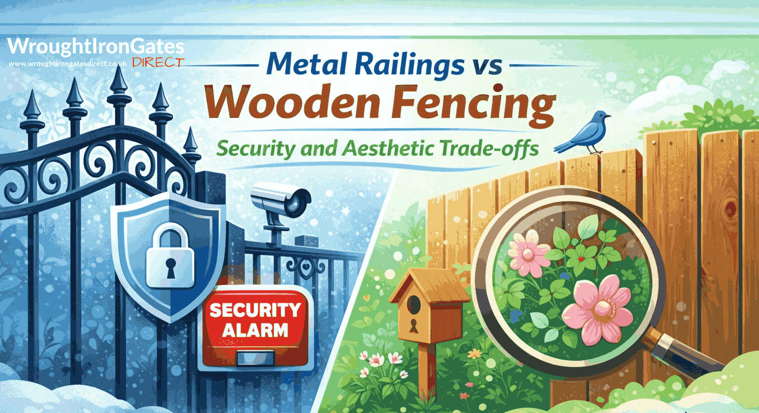 When thinking about choosing between metal railings vs wooden fencing – this goes beyond the material type. Each type has its own set of security benefits and trade-offs, as well as its own unique owner experience and property statements. Homes and properties with metal railings make a completely different statement than those with a wooden fence... different, but both still are effective